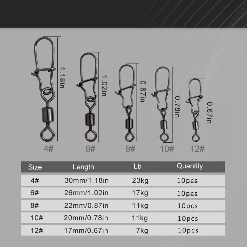 Este set contiene 50 pines conectores de pesca hechos en acero inoxidable con rodamientos giratorios de alta calidad.