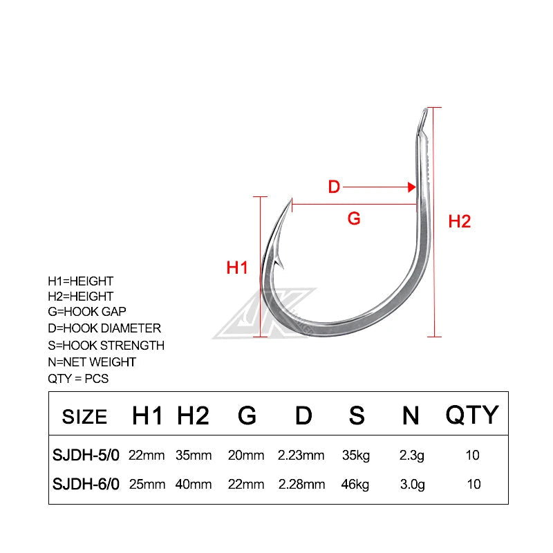 El set de 50 anzuelos JK está diseñado para pesca de jigging lento en mar, especialmente para especies grandes como el atún.