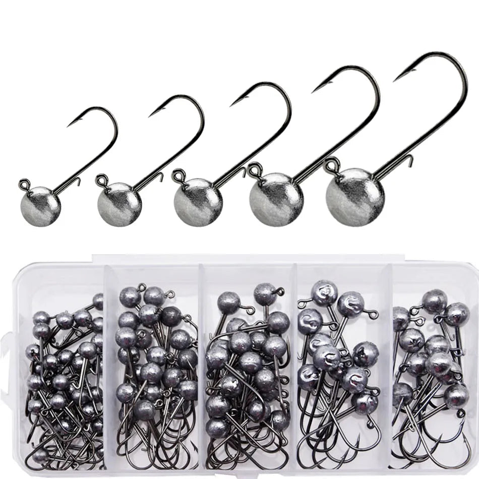 Este set de MrLurion incluye 100 anzuelos tipo Jig Head con cabeza redonda y pesos de 1g a 3g, fabricados en acero de alto carbono.